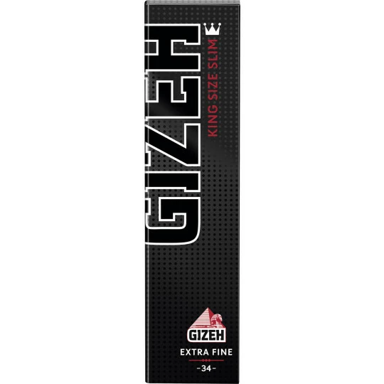 GIZEH BLACK® King Size Slim sind extra feine, fast transparente Blättchen mit einem Flächengewicht von 14 g/m² und einer Gummierung aus natürlichem Gummiarabikum, dem Saft des Akazienbaums. Das extra feine Papier sorgt für puren und unverfälschten Genuss. Die Blättchen haben das King Size Slim Format, brennen sehr langsam ab und gehen aus, wenn nicht an der Selbstgedrehten gezogen wird. Je 34 Blättchen sind in einer Packung mit Magnetverschluss. Und natürlich sind die Packungen vollständig recyclebar.